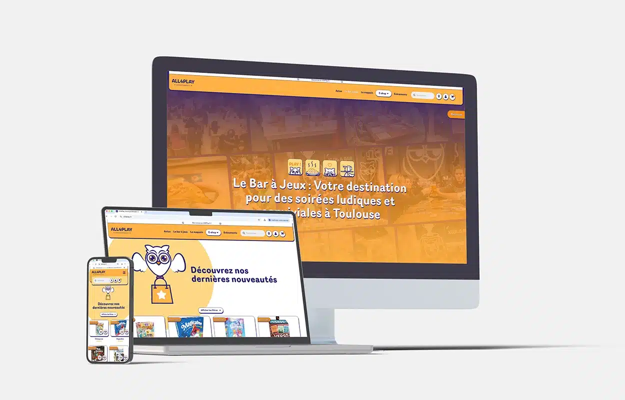 Pour All4Play, nous avons conçu un site vitrine pensé pour traduire son ambiance conviviale, ludique et communautaire. Le design met en avant un univers visuel coloré avec la mascotte chouette, de grandes illustrations d’événements et une navigation segmentée : bar à jeux, boutique, e‑shop, et actualités.