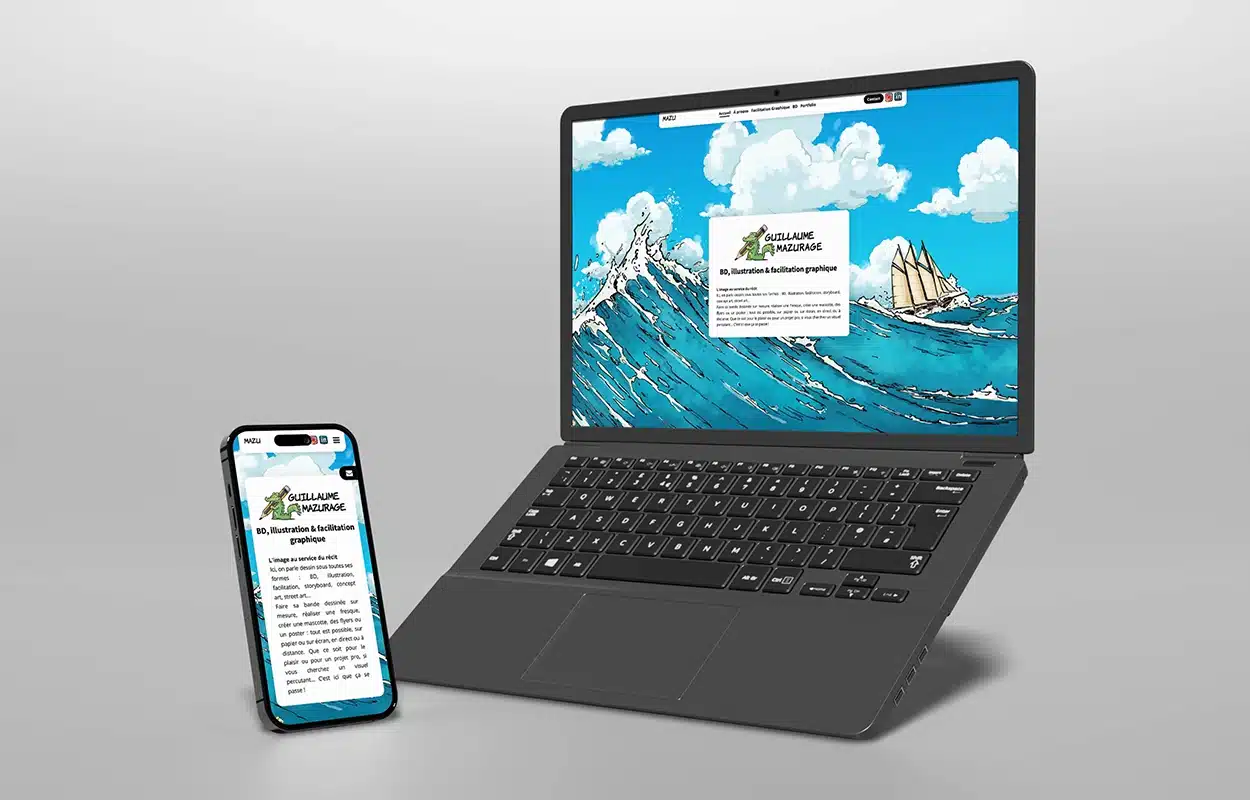 Pour Guillaume Mazurage, nous avons conçu un site vitrine illustratif à son image : créatif, narratif et professionnel. Le design met en avant son univers graphique — bandes dessinées, illustrations, facilitation visuelle, street art — via une mise en page visuelle et immersive.