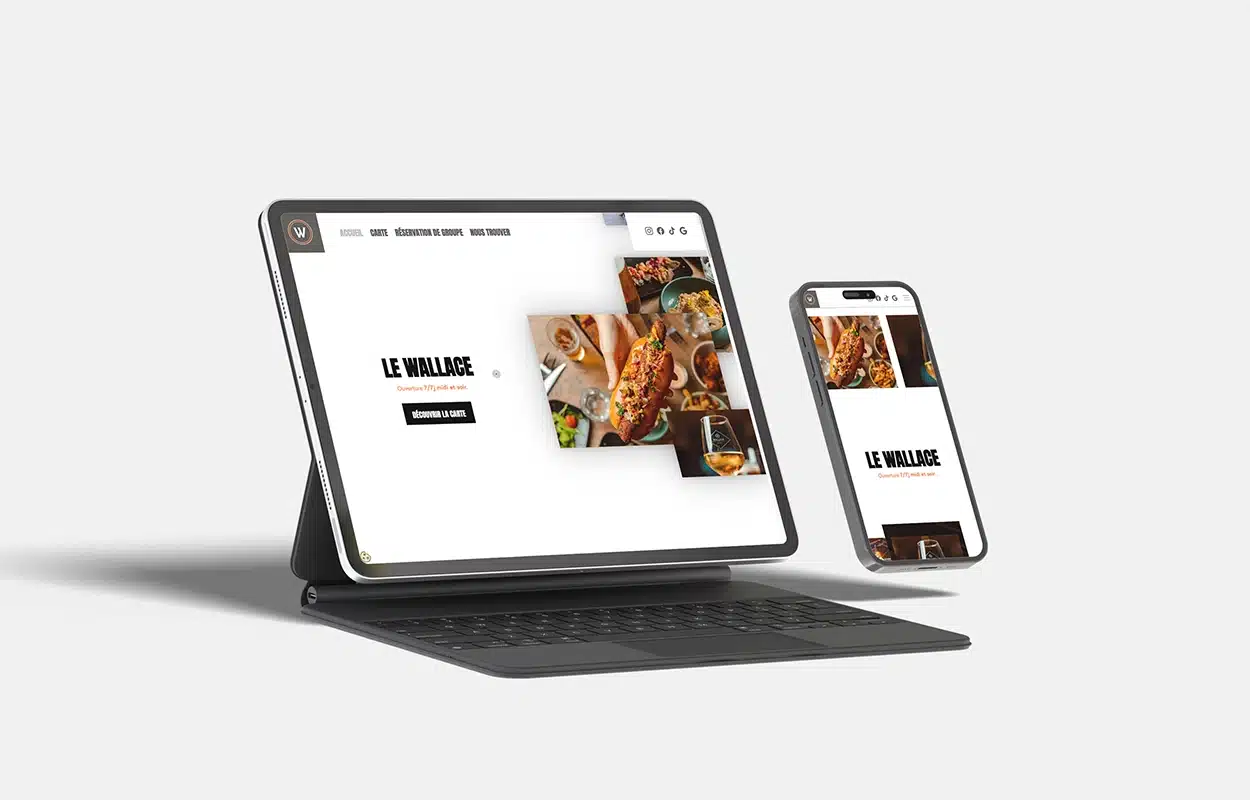 Pour le Wallace Café, nous avons conçu un site à l’image de son ambiance : chic, chaleureux et moderne. L’univers visuel reprend l’esprit cosy du lieu – briques apparentes, néons, terrasse animée –, avec des visuels attrayants (intérieur, cocktails, tapas) et une navigation fluide, pensée pour mobile-first et la réservation rapide.