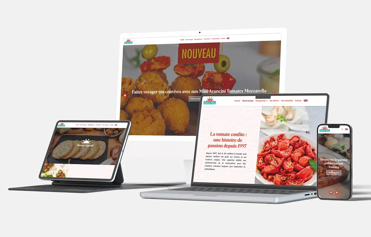 Pour Sud & Sol, nous avons conçu un site vitrine et e-commerce reflétant leur expertise végétale : authentique, dynamique et orienté utilisateurs professionnels. Le design capitalise sur des visuels gourmands, une navigation claire et segmentée : gammes, recettes, actualités, et espace pro/particulier.